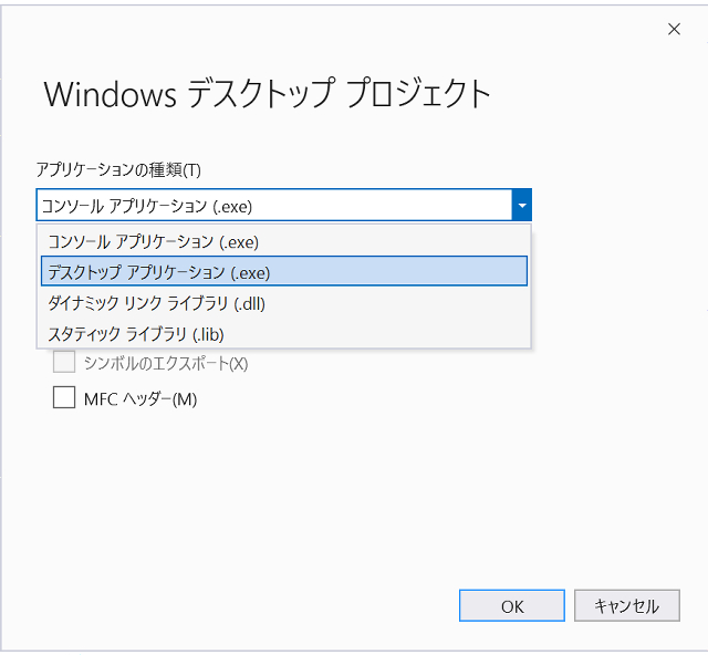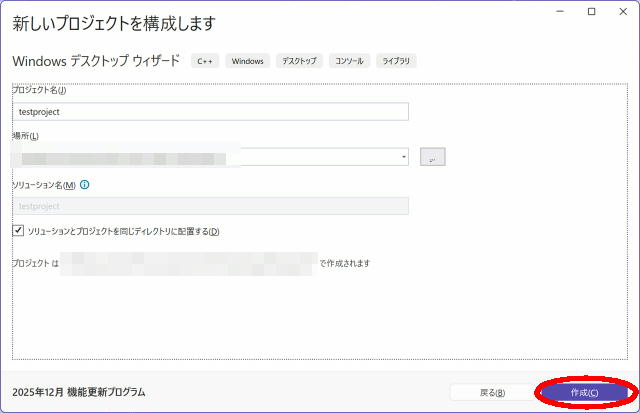 ↑新しいプロジェクトの作成ダイアログが出てくるので、Windowsデスクトップウィザードを選択します。