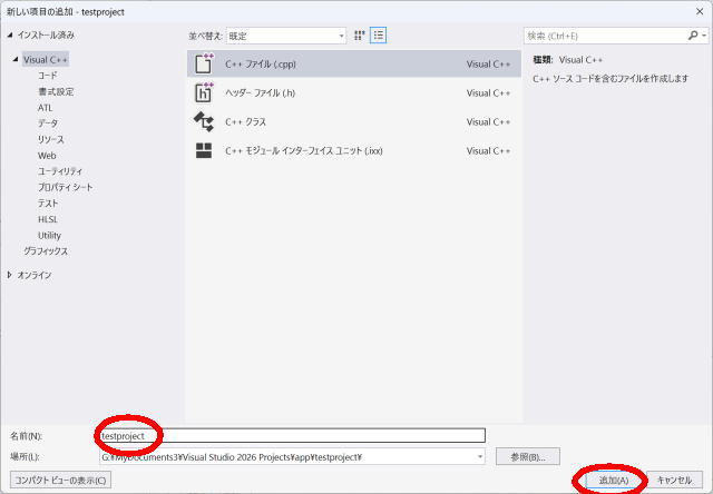 ↑「新しい項目の追加」ダイアログでは、「c++ファイル」を選択します。
